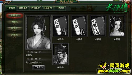 侠名成就 侠名收集是《大侠传中》类似成就的一个系统,随着游戏的推进,玩家能从剧情、副本、天梯等多个方面收集到不同的侠名,如“神雕侠”、“射雕侠”、“屠龙侠”、“星魂侠”等等。不同的侠名能为玩家增加各种不同的属性,提高自身战斗力。上千种独立个人成就,为您撰写江湖笔记,记录您的每一份荣耀,让您找到适合自己的侠义之路,成为可以快意江湖,受万众敬仰的大侠。 ![]() 【侠名成就】