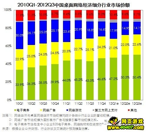 [导读]【数据分析】 Q3网络市场破千亿 网游份额下跌 11月19日消息,艾瑞咨询统计数据显示,2012Q3网络经济市场超千亿,网游份额持续下跌至14.19%。 根据艾瑞咨询最新统计的数据报告,2012年第三季度中国网络经济整体规模