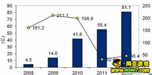 网页游戏在经过近七年的发展后,记者注意到,在近两年中该市场涌现出了大批3D页游产品。如,完美世界公布的3D页游《楚汉传奇》、搜狐畅游独代的《龙歌》、中青宝改编自电影的《全面回忆online》及昆仑万维的《绝代双骄》、《封神无双》等。 业内人的疑问:页游还能增长多久? 事实上,在2009年至2011年之间,页游市场增长非常迅速,但直至2012年初该市场就出现了增速放缓的现象。《2012中国网络游戏研发力量调查报告》数据显示,2012年网页游戏市场实际销售收入81.1亿元,同比增长46.4%。分析人士预测,在2013年时,页游市场将进入平缓增长期。 ![]() 2012年网页游戏市场实际销售收入81.1亿元