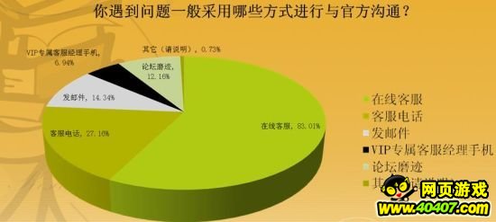 在客服方面,最大的变化是,在线客服已经取代电话客服成为页游厂商和平台最主要的客服服务方式。”负责此次调查项目的51wan助理总裁高楠楠表示。 ![]() 在线客服是玩家与页游厂商和平台最主要的沟通方式