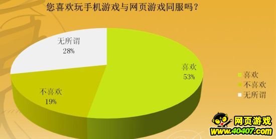 据高介绍,在3年前,玩家与官方平台反馈问题时,电话和在线客服还平分秋色,现在通过QQ等即时通讯工具与游戏客服进行沟通的比率已经提升至83%。大幅度的超过电话方式,且通过在线客服这种新的沟通方式提高了用户满意度,觉得在线客服“一般”和“很满意”的用户占到78%。 “与去年一样,充值及账户安全问题也是玩家关注的焦点,尽管玩家对充值流程满意度高达78%,但是不满意度也达到了22%。”高楠楠说,在这方面玩家关注的焦点是充值操作步骤较多、安全性以及不满意推荐的充值方式。 除了关于平台的满意度外,报告还对参与用户中的手游相关方面进行调查。调查显示,74%的网页游戏玩家曾玩过手机游戏,并且有53%的玩家表示喜欢网页游戏和手机游戏同服的运营模式,这意味着,页游人群开始向手游渗透的趋势非常明显。手机游戏玩家除了游戏本身,这说明手游比网页游戏有更加强大的社区型,更容易形成关系网络。 ![]() 喜欢手机和网页游戏同服的人达到了53%,页游跨端运营成趋势