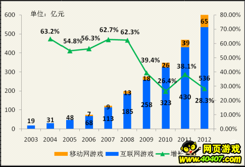 【数据分析】 一、网络游戏市场稳步发展 2012年,以互联网和移动网游戏市场计算,我国网络游戏市场收入规模达601.2亿元,同比增长28.3%。其中,互联网游戏536.1亿元,同比增长24.7%;移动游戏65.1亿元,同比增长68.2%。 ![]() 2003~2012年我国网络游戏市场规模及增长