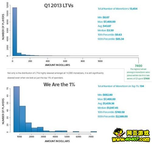 尽管热衷于在移动游戏应用和网页游戏中进行消费的玩家在所有用户中占据不到1个百分点的数量,但是这不足1%的用户在游戏中所进行的开销却在所有的开销中占据了33个百分点。 这是社交游戏分析公司Playnomics得出的结论。这间分析公司以全球范围内超过170万名的移动游戏玩家和网页游戏玩家为对象,对他们在2013年第一季度内的游戏消费行为进行了跟踪调查,并发现只有1400名左右的玩家会选择为应用内或游戏内的虚拟商品进行消费,这部分玩家的人数在所有被调查对象人数中,只占到了大约0.77个百分点。 在下面展示的图表中,这1%的付费用户在图像中的偏移也非常地严重,他们在2013年第一季度的游戏开销范围中,最少的个人大约为700美元,最多的个人则达到了7400美元。Playnomics公司这个结果与“幂次定律分布”多少有些相类似,就是在数量上居于少数的那部分人,反而游戏的开销花费中占据了多数。 ![]() 2013年第一季度游戏开销与玩家数量图——图表来自于Playnomics公司