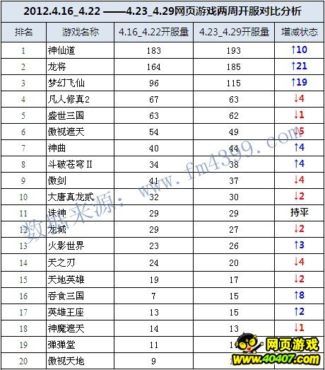 [导读]四、网页游戏两周开服对比分析 从本周页游开服情况来看,《神仙道》、《龙将》、《梦幻飞仙》开服量大幅飙升,其中以《龙将》上升12.8%表现最为突出。《凡人修真2》、《傲视遮天》、《天之刃》则均有所下降。新游《