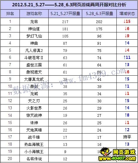 三、运营平台两周开服数据对比分析 ![]() 本周运营平台情况,较上周相比呈现整体小幅下降趋势。开服量上升平台中,以ya247表现最为突出。ya247开服较上周相比上升62.07%,荣登平台开服排行榜第二位。360游戏较上周开服下降10.87%,下滑至排行榜第三名。其他平台小幅波动变化不大。 四、网页游戏两周开服对比分析 ![]() 本周页游开服情况中开服前三名的《龙将》,《神仙道》,《梦幻飞仙》开服量均有所下降。《龙将》依然以突破200组开服量坐稳头把交椅,但开服量较上周下降6.91%。《神仙道》位居第二名,开服较上周下降3.31%。《梦幻飞仙》跌破百服,较上周开服下降8.57%。开服量上升游戏中,以《斗破苍穹2》最为明显,上升17.46%。新游近几周表现良好,《小小海贼王》本周开服增加66.67%,《惊天战神》本周开服增加42.11%。 五、本周运营平台主打游戏一览 ![]() 本周运营平台方面,37wan主打游戏为《龙将》、《神曲》,两款热游仍以每天两组的开服量分别占37wan开服总量的23.7%。49you主打《神仙道》保持每天一组的开服。51wan同时选择《神仙道》,《龙将》为主打游戏,保持每天一组的开服量。360游戏,ya247,91wan等均未选择主打游戏。 感谢网页游戏分析报告(www.fm4399.com)提供数据支持! |