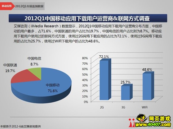 2012Q1中国移动应用下载用户运营商分布方面,中国移动的用户最多,占71.6%,中国联通的用户占比为19.7%,中国电信的用户占比则为8.7%。移动应用下载用户使用过的联网方式方面,使用过2G网络下载应用的占比为72.1%,使用过3G网络下载应用的占比为25.7%,使用过WiFI下载用户的占比为48.6%。 ![]() 2012Q1中国移动应用下载用户运营商&联网方式调查