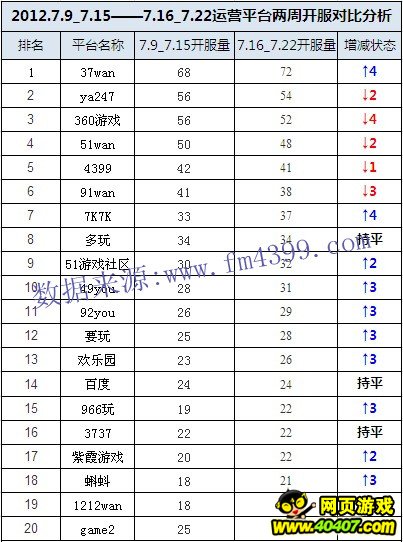 [导读]三、运营平台两周开服数据对比分析 本周平台开服状况较为稳定,且大部分平台开服有所增加。多玩、百度及3737平台开服与上周持平。game2开服较上周相比下降20%较为明显;7k7k游戏平台较上周增加12.12%。其他平台开服