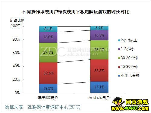 2、不同性别用户单次游戏时长对比 •男性与女性用户单次游戏时长情况差别不大 调查数据显示,男性与女性平板电脑用户在单次游戏时长方面的情况整体接近,差别并不明显。单次游戏时长在60分钟以下的用户比例均在七成以上,占据绝对主流。差别较为明显的是,女性用户中单次游戏时长在2小时以上的比例超一成,较男性高4.1个百分点。 ![]() (图) 不同性别用户每次使用平板电脑玩游戏的时长对比