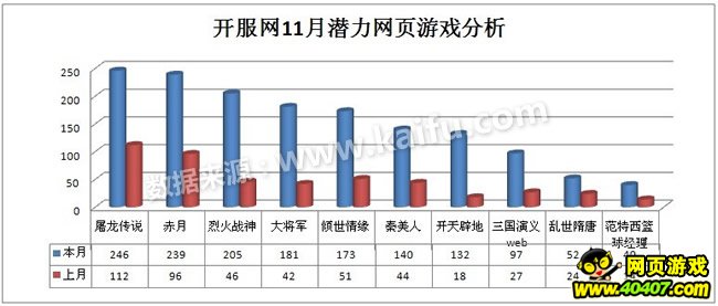 四、本月潜力网页游戏分析 ![]() 本月有很多非常有潜力的网页游戏开服量上涨速度惊人。最突出的游戏是《开天辟地》、《烈火战神》和《大将军》,《开天辟地》本月开服132组,较上月相比开服量增加了633%。《烈火战神》本月开服205组,较上月相比开服量上涨了346%。《大将军》本月开服181组,较上月相比开服量增加了331%。其实涨幅较大的游戏是《三国演义web》、《倾世情缘》、《秦美人》,开服量分别上升259%、139%、218%。《范特西篮球经理》、《赤月》、《屠龙传说》、《乱世隋唐》等上涨速度也是比较快的。