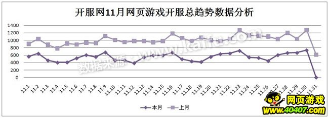 五、本月网页游戏开服总趋势数据分析 ![]() 通过10月页游走势图开服分析,本月网页整体有所上涨。从曲线图我们可以看出大部分厂商每周都有一次发力,跟上月发力方针基本保持一致。11月开服总量为16044服,从整体数量上来看本月整体开服数量与10月相比有一定涨幅,环比增涨9%。