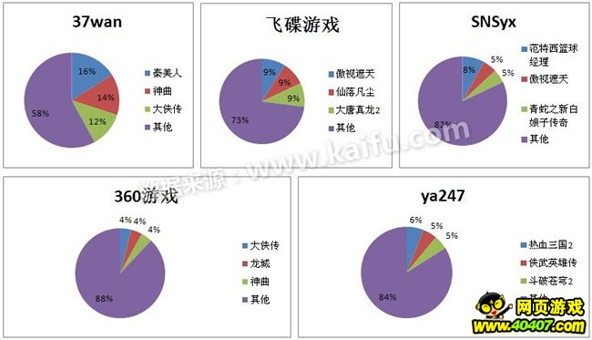 六、本月运营平台主打游戏一览 ![]() 本月运营平台方面,37wan平台主打游戏为《秦美人》、《神曲》、《大侠传》,其中《秦美人》占到了16%的开服比率,《神曲》、《大侠传》分别占14%、12%的开服比率。飞碟游戏平台主打《傲视遮天》、《仙落凡尘》、《大唐真龙2》,均占9%的开服比率。SNSyx平台主打游戏为《范特西篮球经理》、《傲视遮天》、《青蛇之新白娘子传奇》,三款游戏分别占8%、5%、5%的开服比率。360游戏平台主打《大侠传》、《龙城》、《神曲》,均占4%的开服比率。ya247平台主打游戏为《热血三国2》、《侠武英雄传》、《斗破苍穹2》,分别占6%、5%、5%的开服比率。其他平台均未选择主打游戏。