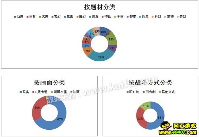 七、本月新游分析 ![]() 10月份公布了59款新游。按题材划分,有20款三国游戏、10款武侠游戏、7款仙侠游戏、6款魔幻游戏、5款玄幻游戏、4款神话游戏、4款历史游戏、3款都市游戏、3款修真游戏、2款奇幻游戏、2款科幻游戏、1款体育游戏、1款军事游戏、1款宠物游戏。按画面划分,有40款写实游戏、18款Q版卡通游戏、1款国画水墨游戏、1款油画游戏。按战斗方式划分,有33款即时制游戏、19款回合制游戏,8款其他战斗方式游戏。其中进行技术测试的有3款、封测的有34款、内测的有10款、公测的有7款、正式运营的有5款。新游开服趋势主要向三国、写实、即时制方向发展。