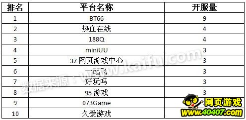 八、本月新平台排行 ![]() 本期的页游分析到此完毕,更多数据类别目前还在讨论整理中,后续将陆续推出。感谢开服网www.kaifu.com数据中心提供数据支持!