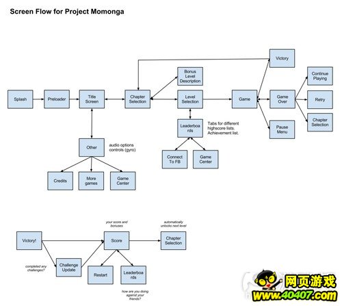 (上图分别是《愤怒的小鸟》,《卡勒瓦拉英雄》,《鱿鱼小英雄》以及《翼飞冲天》的界面。) 寻找参考游戏主要是为了让设计师能够发现其华丽图像之外的界面布局原理。但是盲目地复制其它游戏设计却不是一种好方法,因为别人的设计不一定符合你的需求。这时候设计师需要自问: *我需要向玩家传达哪些信息? *玩家需要哪些功能? *需要突出哪些内容? *窗口处于何种环境中? 注:使用参考范本作为自身设计的灵感和基准,但切记盲目复制,你只要从中学习便可。 4.制作流程图 在你开始面向个别屏幕进行设计前,请先列出可能会出现于你游戏中的所有窗口。 随后,你需要创造这些屏幕的流程图,也就是我所说的“屏幕流程图”。这是一种手动操作的流程图,能够呈现出所有屏幕彼此间的关系。当你完成了一个关卡后,哪个屏幕会最先出现?你是否能够从主菜单直接进入最高分数榜单页面?这都是一些复杂的问题,你可以在整个设计过程中不断对屏幕流程图做出调整。 以下便是《Momonga》的屏幕流程图: ![]() Momonga流程图(from paladinstudios)
